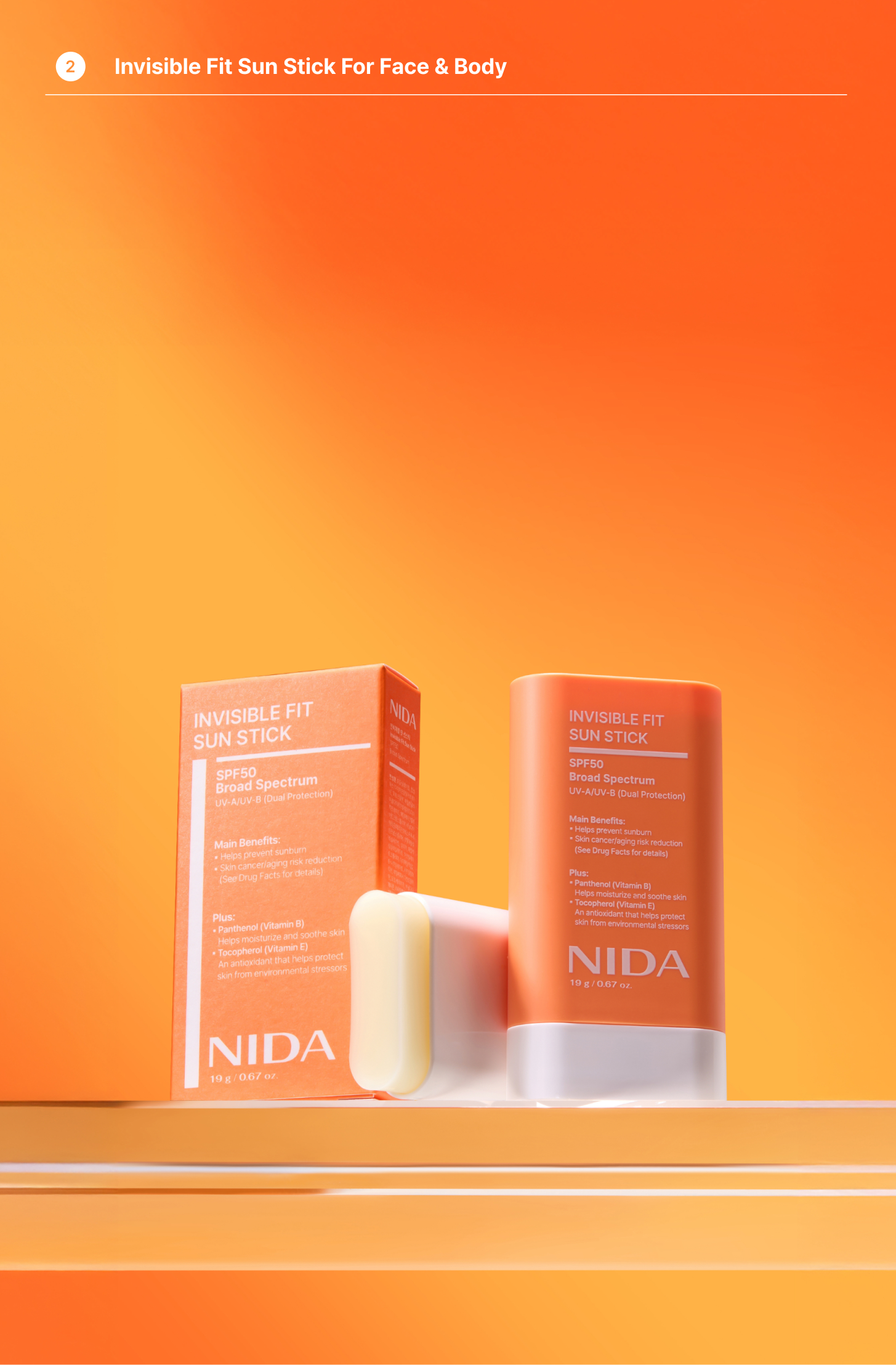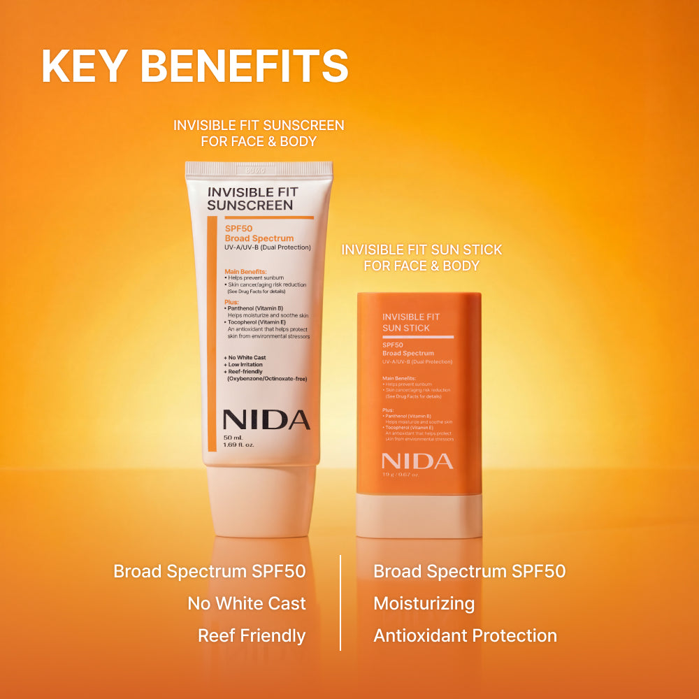 Sunscreen + Sun Stick — Your Complete Sun Protection Duo🌟 Get full-coverage sun protection wherever you go. The NIDA Invisible Shield Sun Duo pairs a lightweight sunscreen with a portable sun stick — so your skin stays protected from UV rays all day long. ☀️🛡️